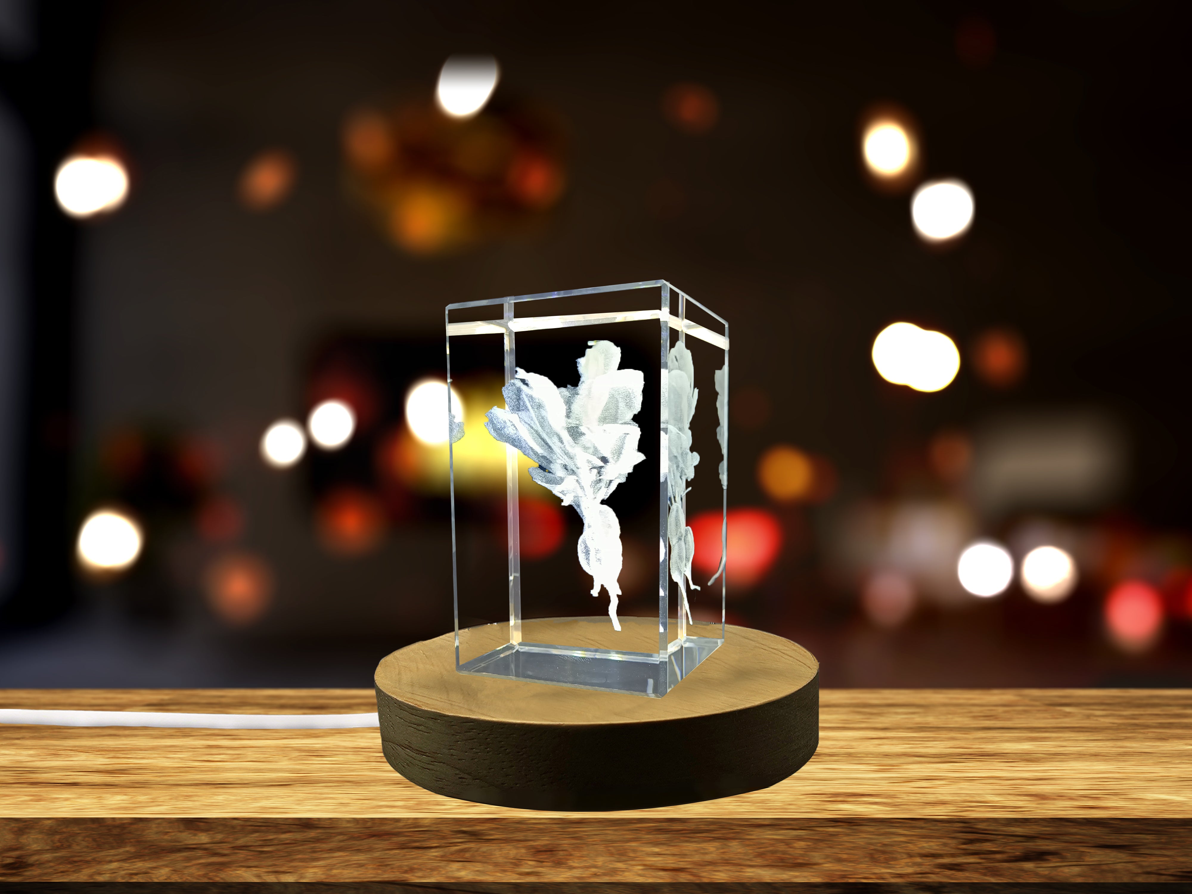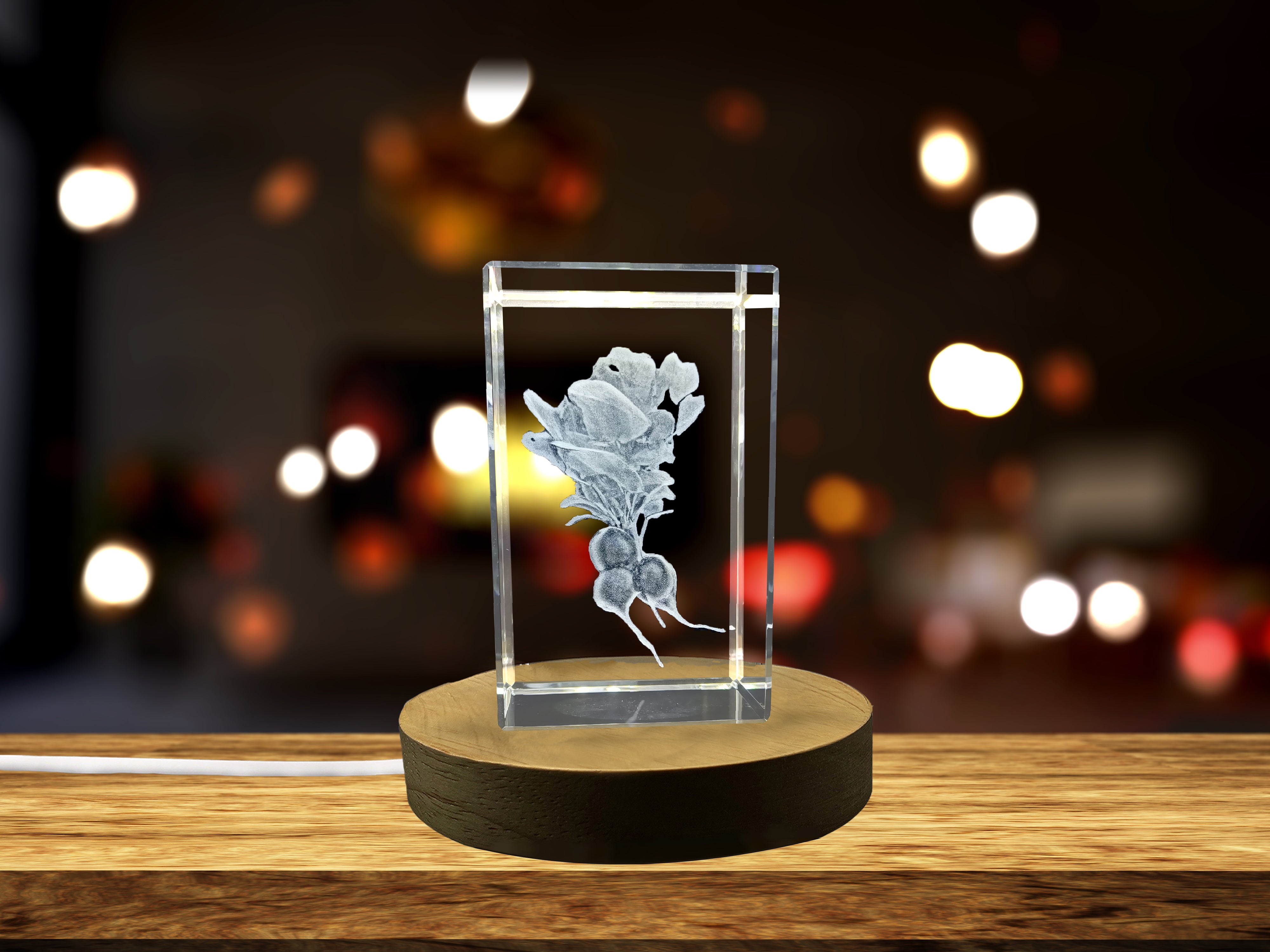 The Radish 3D Engraved Crystal Sculpture is not only a visual masterpiece but also includes a FREE round LED base that enhances its beauty with a soft glow. This LED base is plug-in ready and can turn your sculpture into a mesmerizing light feature, perfect for any occasion.