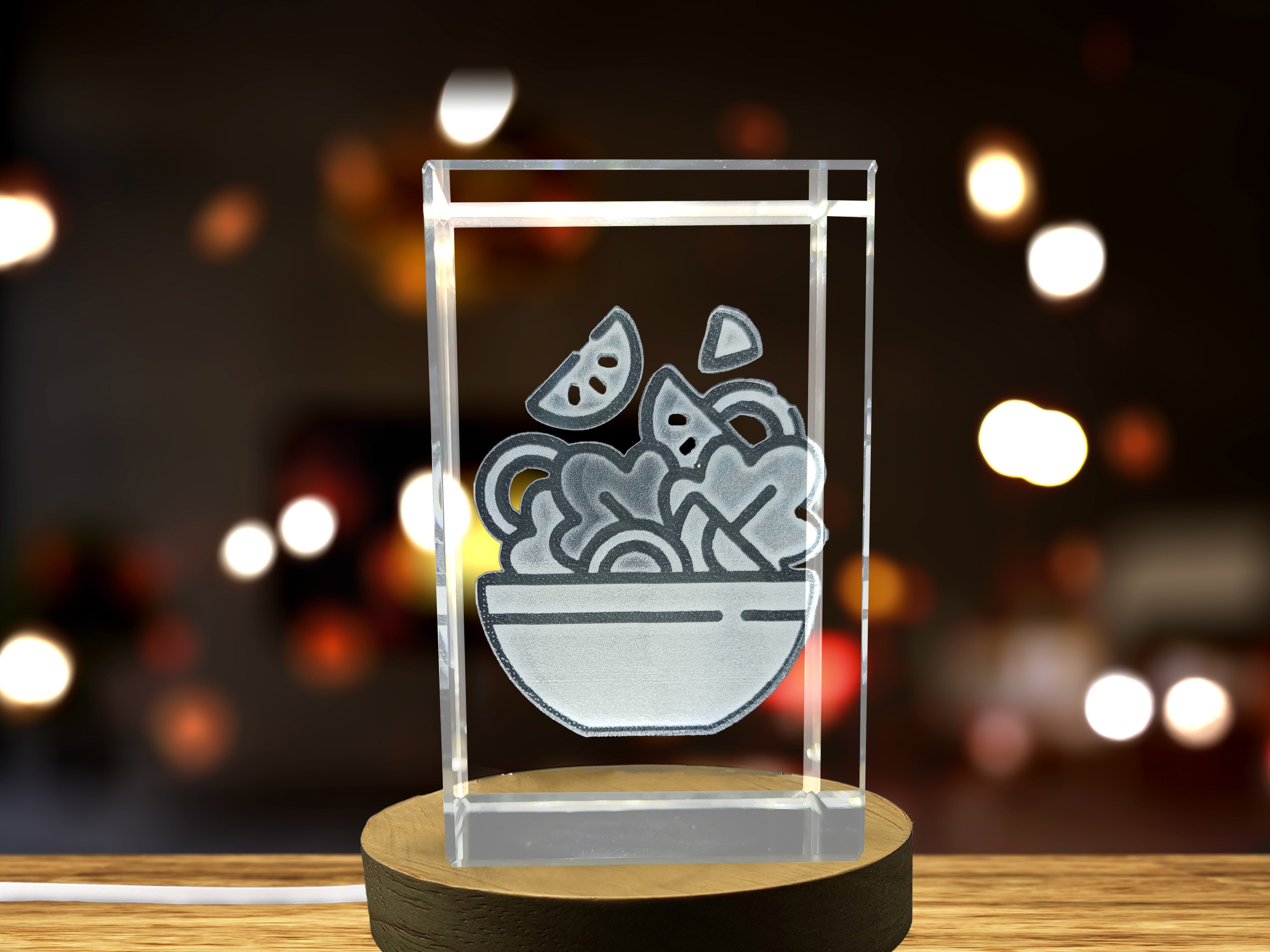 Elegant Crystal Salad Bowl With 3D Engraved Food Icons - Recognition Gift With LED Base