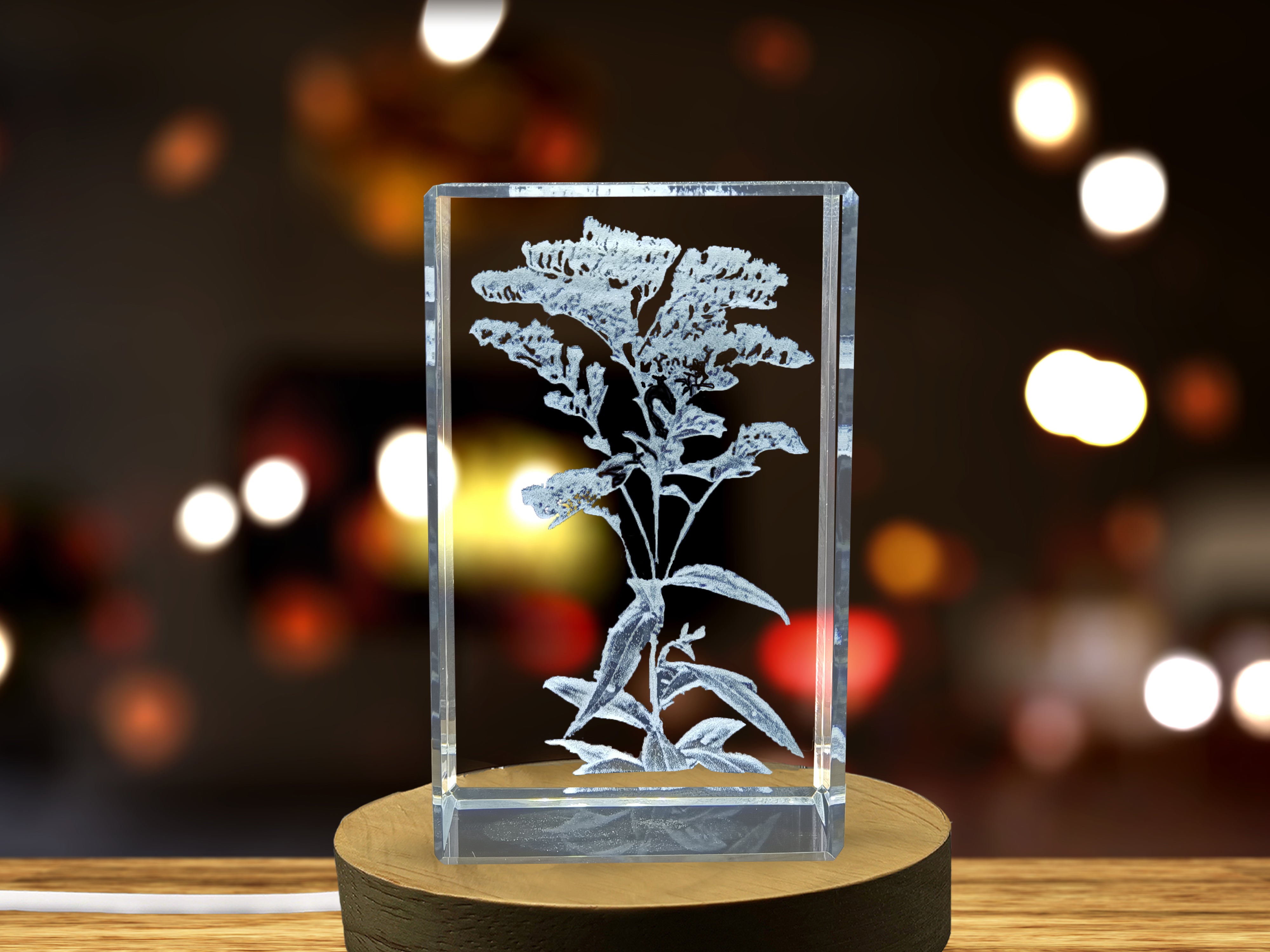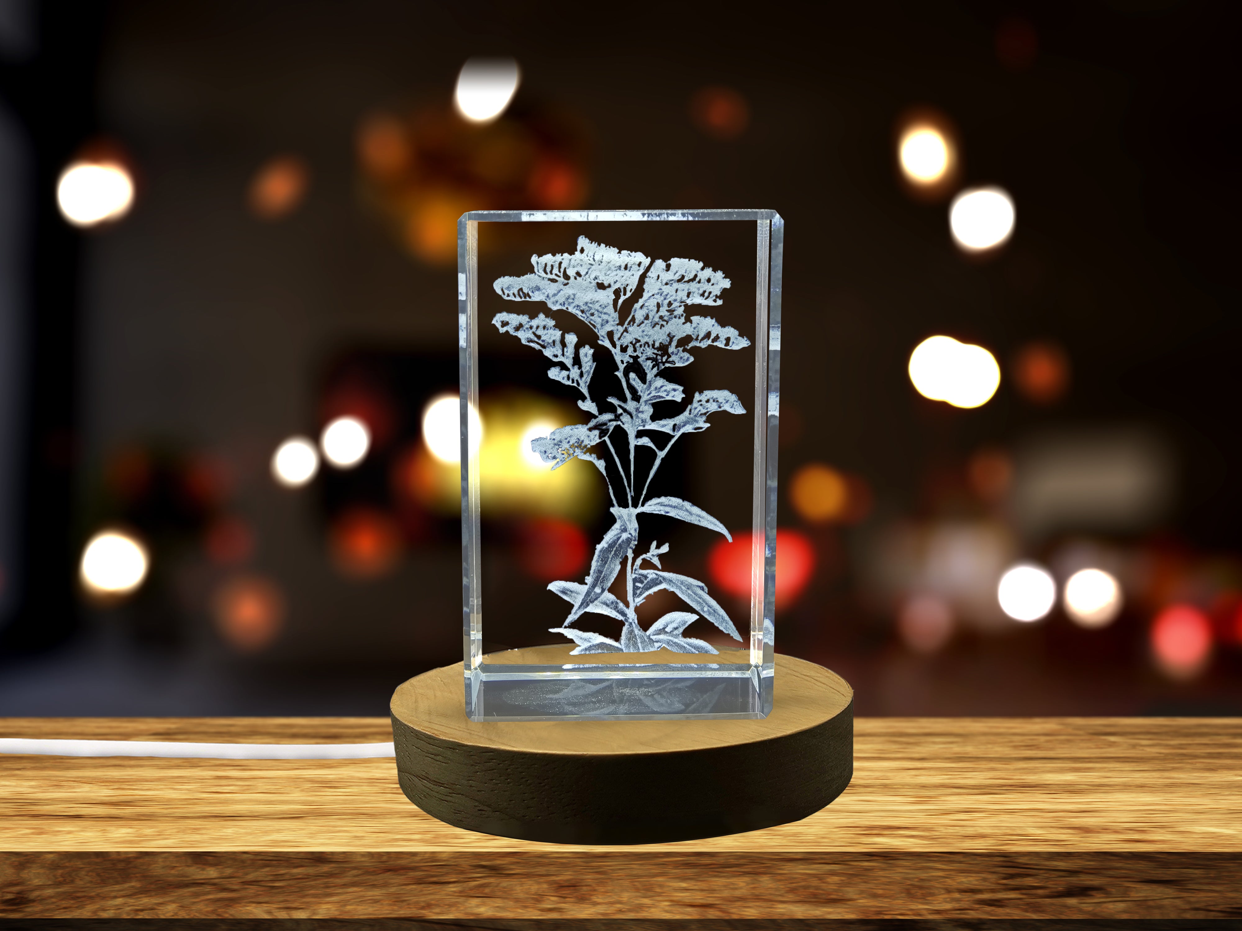 Handmade and responsibly made-to-order in Canada, this masterpiece showcases intricate 3D engraving technology. The craftsmanship of this crystal art piece allows for detailed representation, illustrating the delicate structure of the Goldenrod wildflower.
